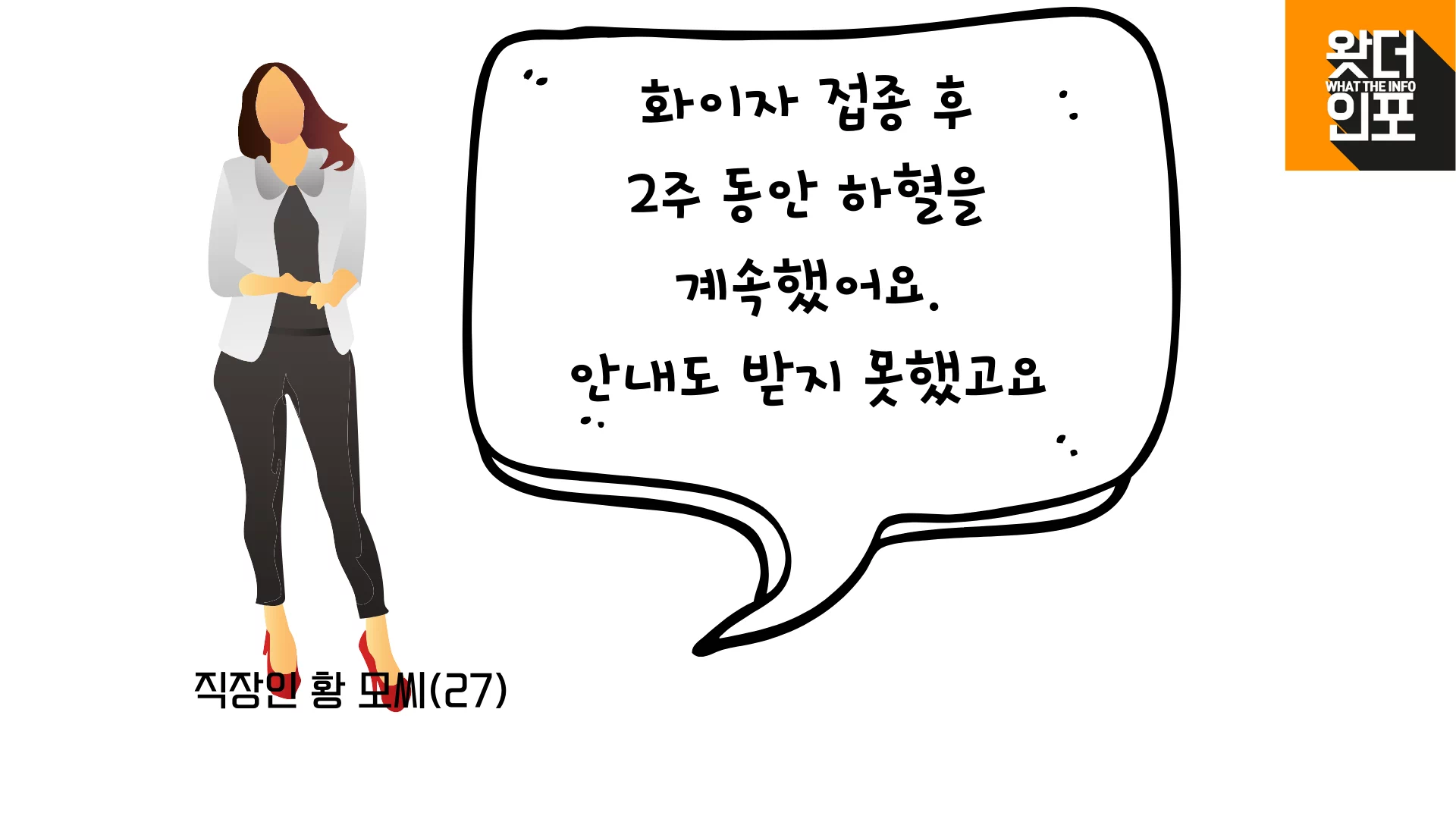 황 씨는 "백신을 접종할 때 부정출혈에 대해 전혀 안내받지 못했다.", "안내를 해주지 않아 부정 출혈이 계속되면서 몸에 문제가 생긴 건 아닌지 걱정을 더 많이 하게 됐다."라고 합니다.